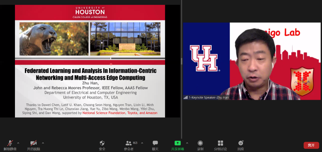 美国休斯顿大学电子和计算机工程系及计算机科学系教授、美国人文与科学学院和电气与电子工程师协会会士韩竹,作了《以信息为中心的网络和多通道边缘计算中的联合学习和分析》(Federated Learning and Analysis in Mobile Edge Computing)的主题报告。