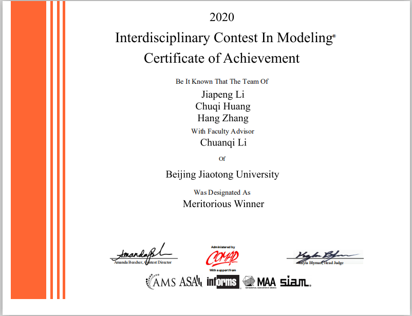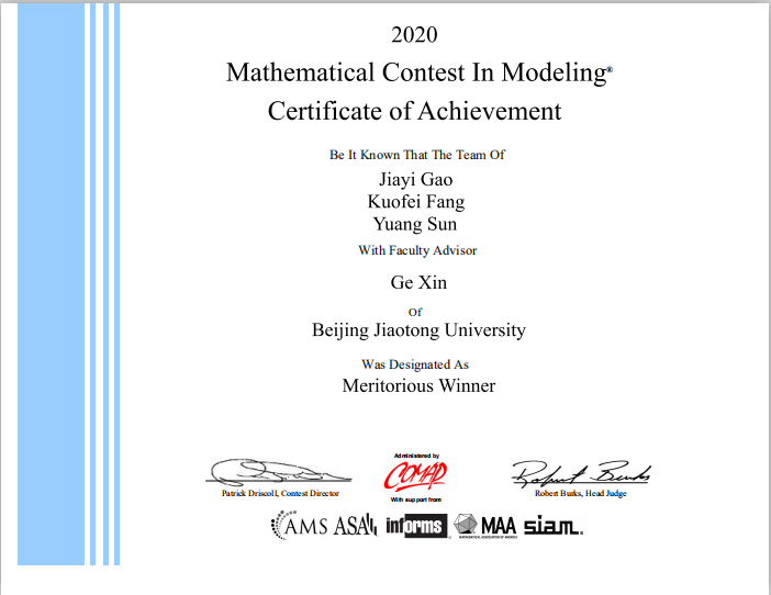 Mathematical Contest in Modeling is sponsored by the Consortium for Mathematics and Its Application which is the unique and most influential international mathematical modeling contest in the world. The competition involves a series of fields such as economy, management, environment, resources, ecology, medicine, safety, etc. Three people (undergraduates) form a group to complete all works of from modeling, solving, verification to thesis writing within four days, which presents the contestants' ability of scientific research and team spirit. It is the originator of various mathematical modeling competitions.