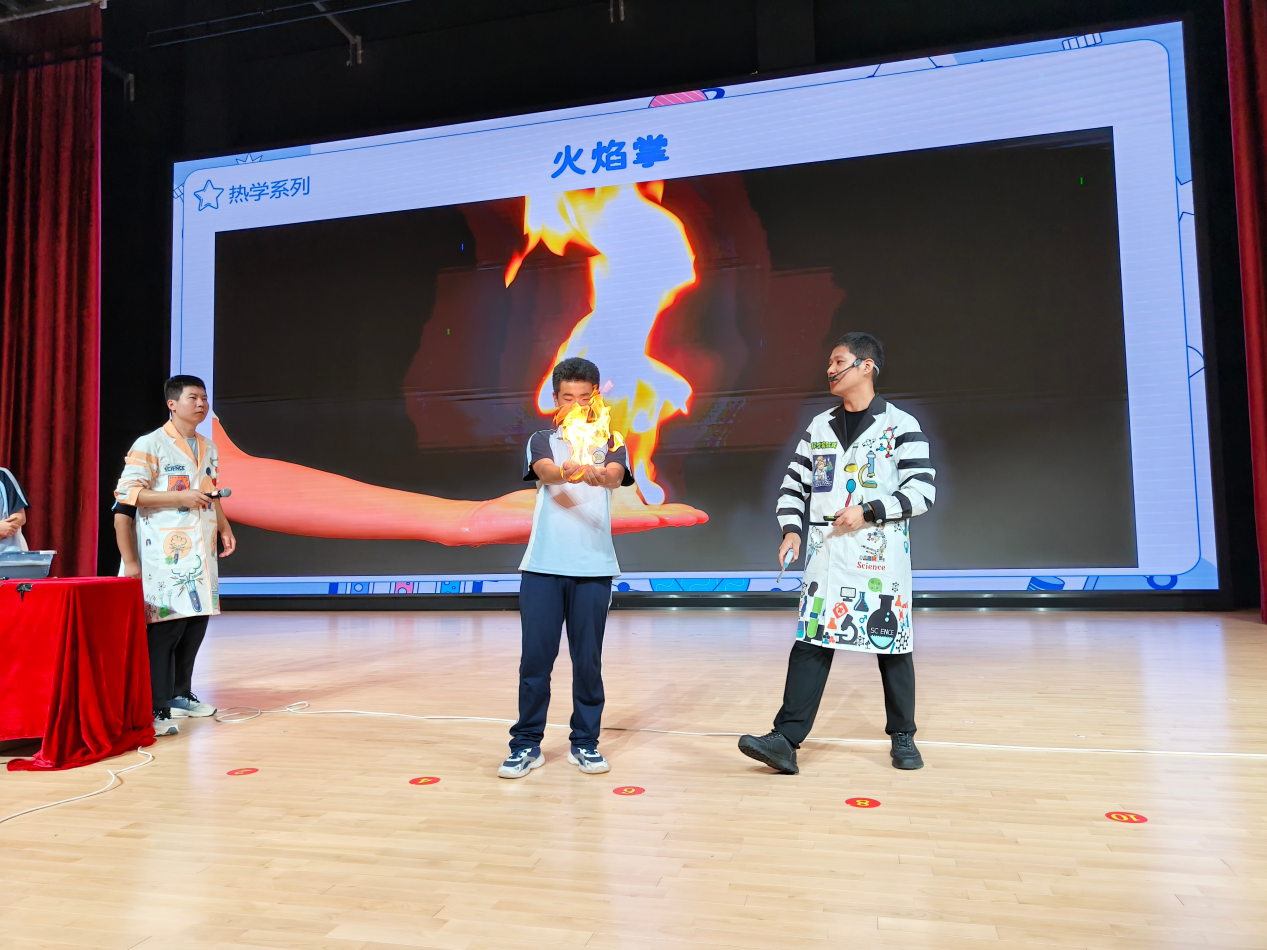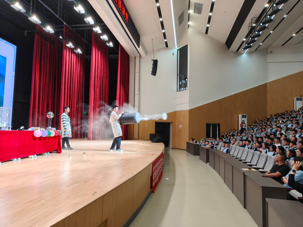 活动现场,科普团队人员表演了空气炮、火焰掌、触摸闪电、超导磁悬浮、液氮蘑菇云、静电高压、粉尘爆炸等十几个科普项目;通过生动的解说,将深奥的科学理论转化为直观的现象,唤起学生们对科学的热情。在互动阶段,团队邀请学生登台参与科普实验,亲身感受科学的神奇魅力。