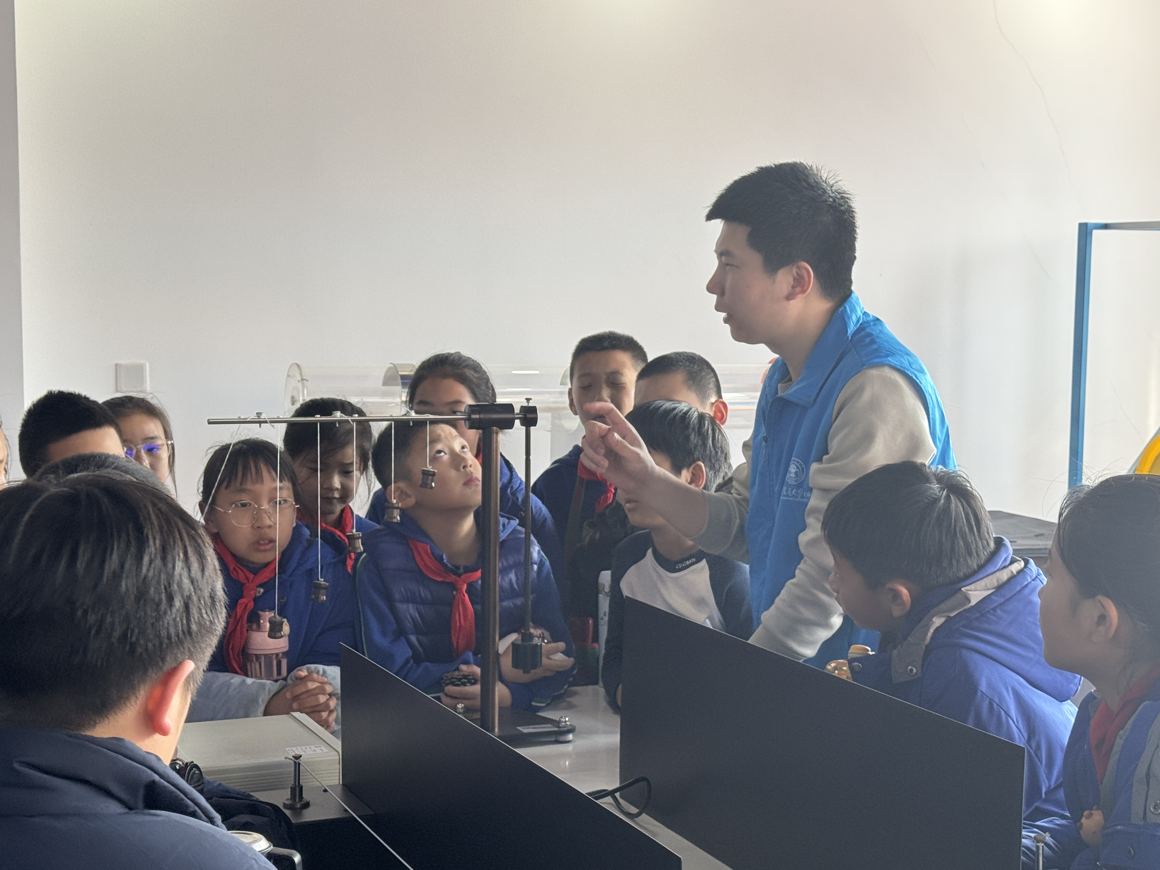 威海南海新区天立学校的教师和同学们依次参观了力学、电磁学、振动与波、光学、立体与综合和热学与综合演示实验室,体验了角动量守恒转台、直升机演示仪、特斯拉放电演示仪、大型法拉第笼、大型弹簧纵横波演示仪、共振摆、衍射光栅、3D电影和蒸汽机演示仪等众多科普演示项目。
