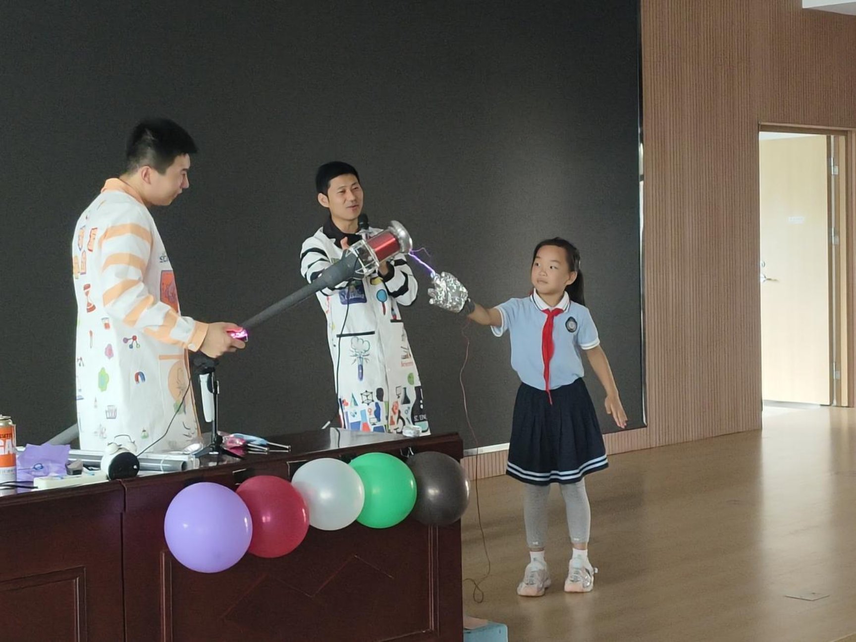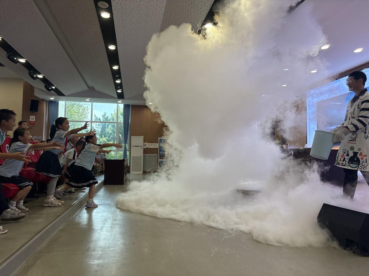 活动现场,科普团队人员表演了空气炮、火焰掌、触摸闪电、超导磁悬浮、液氮蘑菇云、静电高压、粉尘爆炸等十几个科普项目;通过生动的解说,将深奥的科学理论转化为直观的现象,唤起学生们对科学的热情。在互动阶段,团队邀请学生登台参与科普实验,亲身感受科学的神奇魅力。