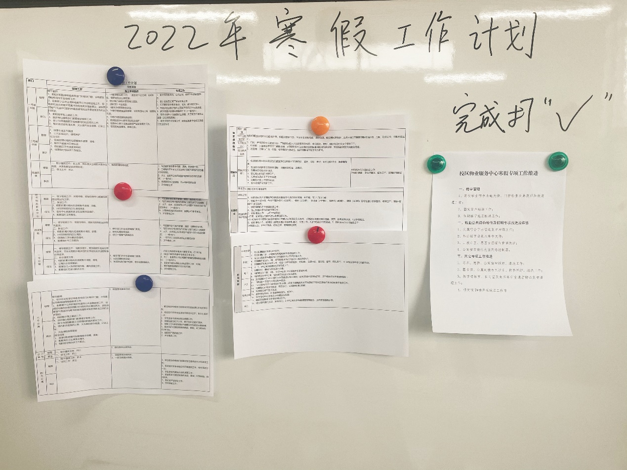 寒假期间,物业服务中心重点推进校园周边及楼宇管理、公共设施检修、专项工程改造与维修及其它保洁清理工作,在疫情防控常态化背景下,引导师生对快递包裹“立取立走”,提高安全防范意识,细心巡查,确保校园平安;饮食中心根据留校师生人数变化,及时调整优化供餐方式及规模,加强冷链食品管理,精准落实疫情防控措施。