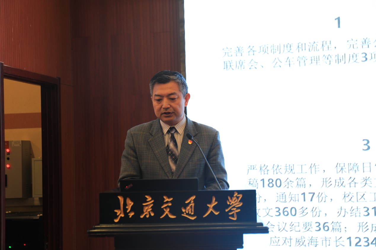 On Dec 29, directors of thirteen departments of BJTU Weihai made an annual report of their achievements in the past year, exchanging experiences with their counterparts. With all the staff being involved in the assessment, the Student Affairs Office was chosen as winner of Gold Award of Excellence, the IT Center and Campus Services Office as winners of Silver Award of Excellence, and Dept. of Teaching and Learning Support as winner of Innovation Award of Excellence.