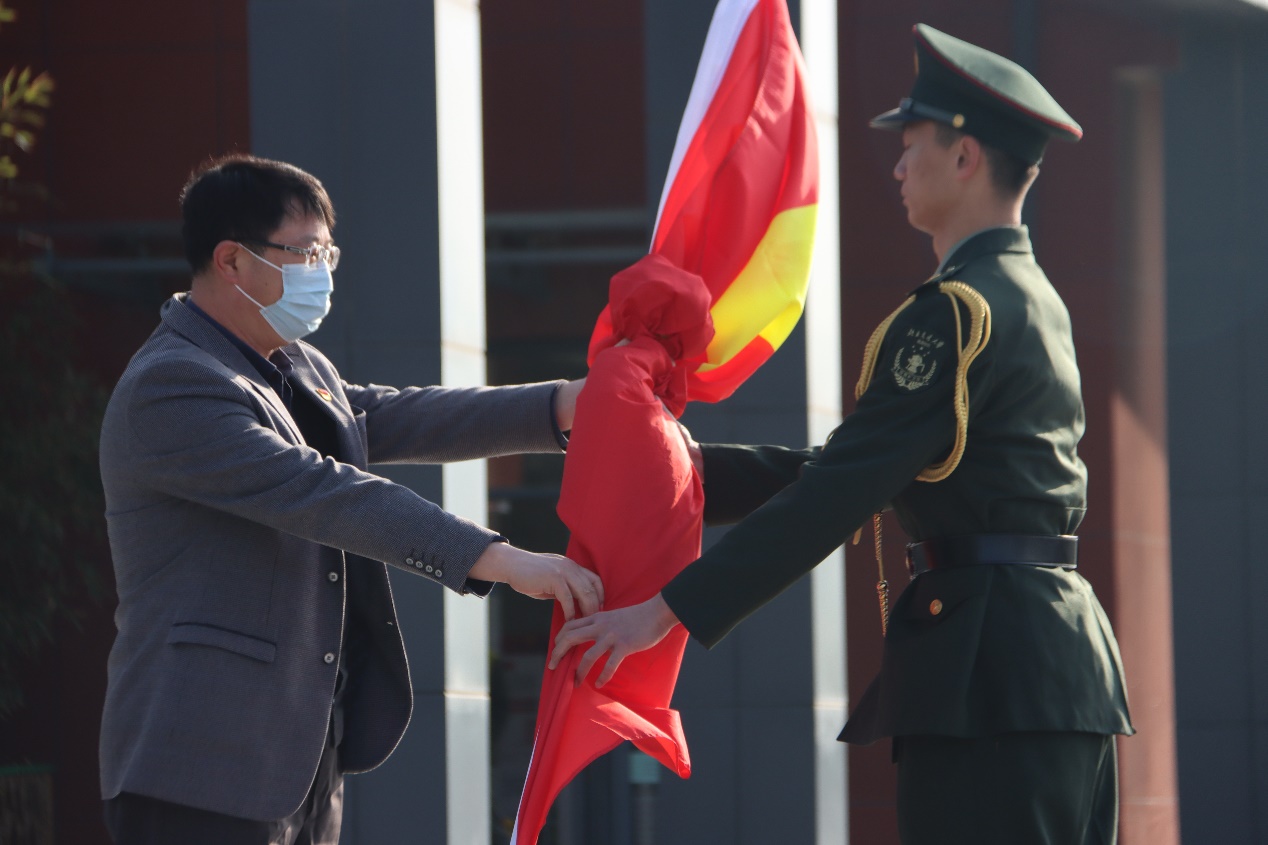 白延雷向国旗班授旗,现场师生面向国旗,行注目礼。在激昂国歌中,五星红旗冉冉升起、悠悠飘扬。