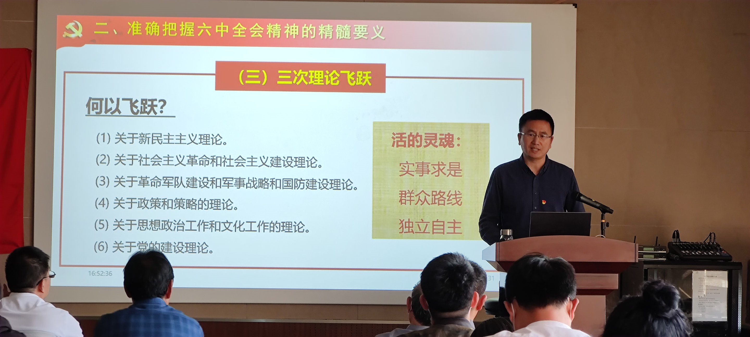 孙文博书记首先介绍了党的十九届六中全会的基本情况,并强调会议审议通过的《中共中央关于党的百年奋斗重大成就和历史经验的决议》(下文简称《决议》),是这次全会的主要任务,也是这次全会的最重要成果。《决议》既是一篇具有极强历史穿透力、思想引领力、政治动员力、时代感召力的马克思主义纲领性文献,也是新时代中国共产党人牢记初心使命、坚持和发展中国特色社会主义的政治宣言,更是以史为鉴、开创未来、实现中华民族伟大复兴的行动指南。