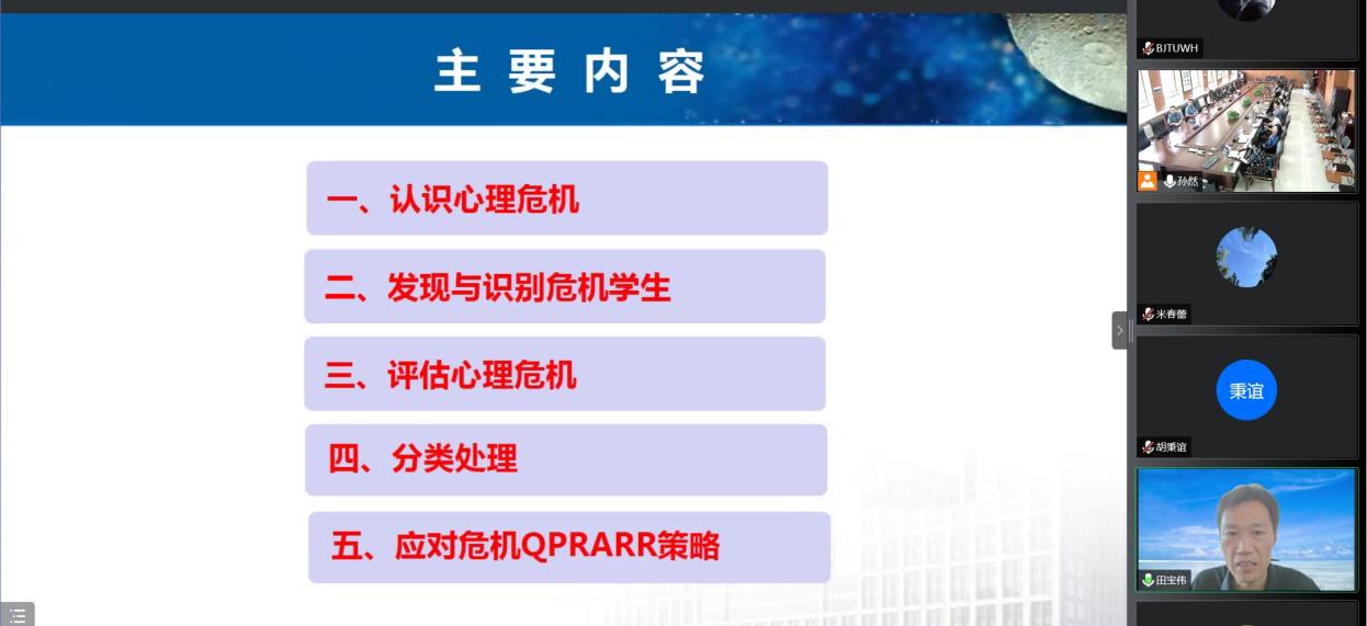 田宝伟老师介绍了如何发现、识别以及评估心理危机学生,并对处理心理危机的工作思路和流程进行了详细讲解,并针对辅导员及班主任如何应对危机事件提出了实用性策略和建议。
