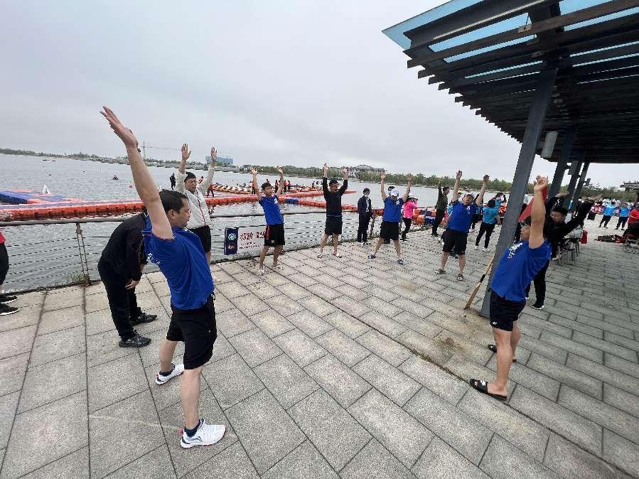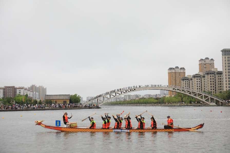 “鼓声三下红旗开,两龙望标目如瞬”,点睛仪式结束后,随着一声号令响起,现场鼓声阵阵,队员们随着鼓点奋力挥桨、劈波斩浪,赛道里水花飞溅、擂鼓震天;岸边啦啦队为参赛队伍大声呼喊。