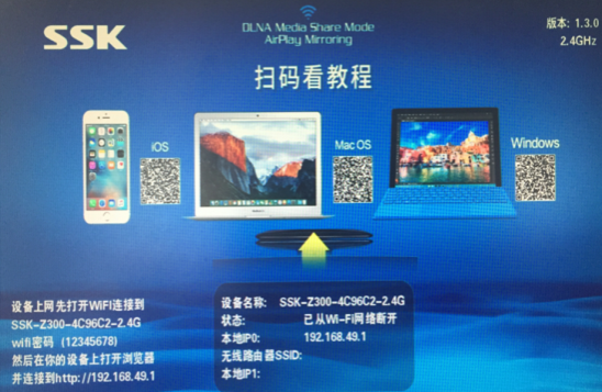 2、 首先把设备开机到DLNA(2.4G/5G)状态下、看自己电脑支持2.4G还是5G,所有的电脑同屏都是在这状态下完成。电脑直连Z300Wifi。