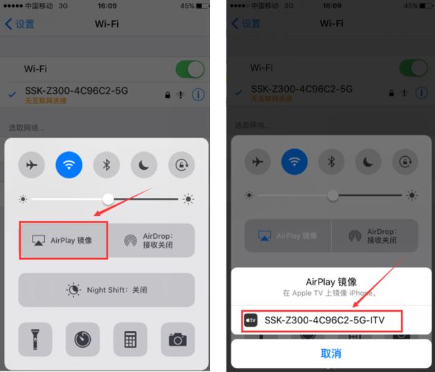 5、手机屏幕上滑,出现Airplay镜像,点击就会出现产品wifi,再次点击产品wifi,就会进入推屏状态。