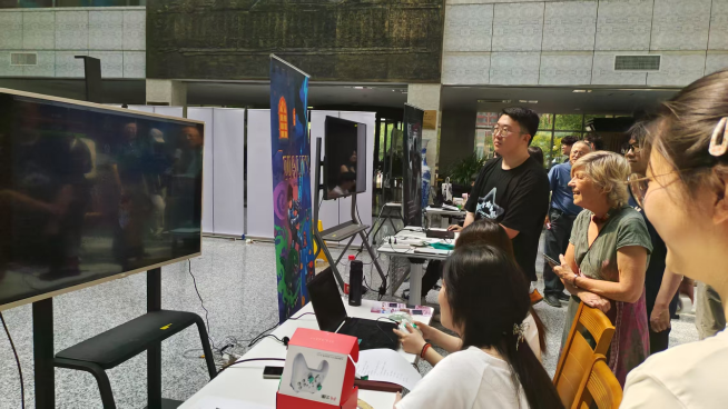各项目小组精心布展,准备了宣传展板、自制周边与互动资料,现场学生积极向师生介绍项目构思、开发过程与技术实现,展现出良好的表达能力与专业素养。其中有多个项目在技术融合与玩法设计上大胆突破,广泛引入增强现实(AR)、虚拟现实(VR)技术以及基于AI大模型的自然语言对话系统,将前沿科技与创意表达深度融合,打造出一批极具沉浸感和互动性的高质量作品。例如,一款F1赛车竞速游戏,在物理引擎调校、操作手感和场景构建等方面实现了多种驾驶视角、真实赛道模拟和动态天气系统,操作流畅,现场体验者普遍反馈良好;另一款致敬《Elden Ring》的ARPG游戏,融合开放世界探索、多技能成长、BOSS挑战等核心玩法,实现了高度沉浸的游戏体验;《云瑶封魂录》游戏利用手势识别和增强显示实现体感互动游戏。参展的游戏作品都各具特色,不仅体现了学生在编程、美术与交互设计方面的综合能力,也彰显了计算机专业在融合技术创新与跨文化交流方面的教学成效。
