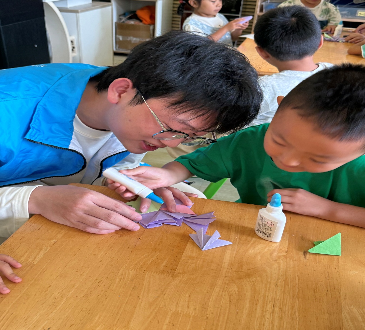红色教育讲解环节结束后,志愿者在老师的协助下,有序组织小朋友进行小红花折纸和小红花绘制活动。孩子们在哥哥姐姐的陪伴下,尽情发挥自己的想象力与动手能力,创造出自己心中代表英雄的那一朵“小红花”。童真与革命记忆的碰撞,彰示着红色种子悄然萌芽。