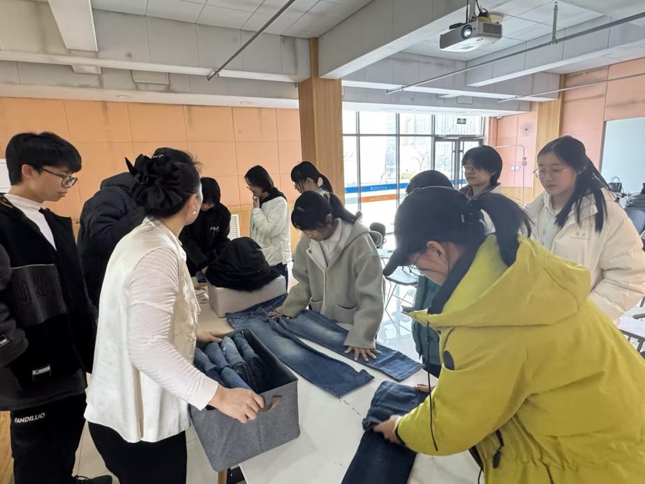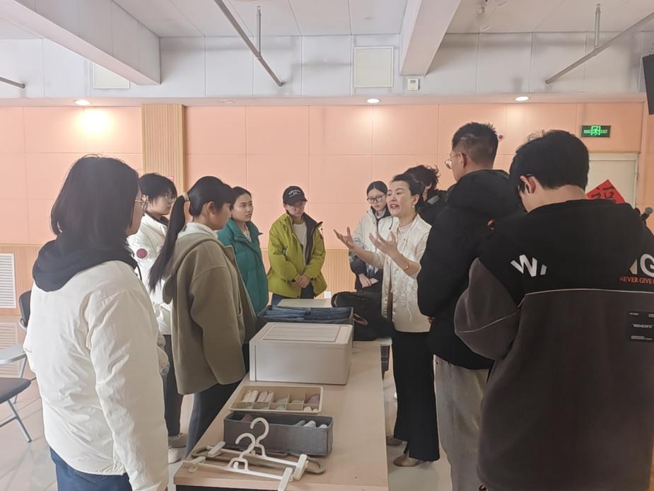 在实操演练环节,王老师演示了各类衣物折叠、收纳摆放、空间层次划分等实用技巧。同学们认真观摩学习,随后运用所学技巧现场练习折叠衣物、规整物品,王老师则对操作细节逐一进行点评与指导