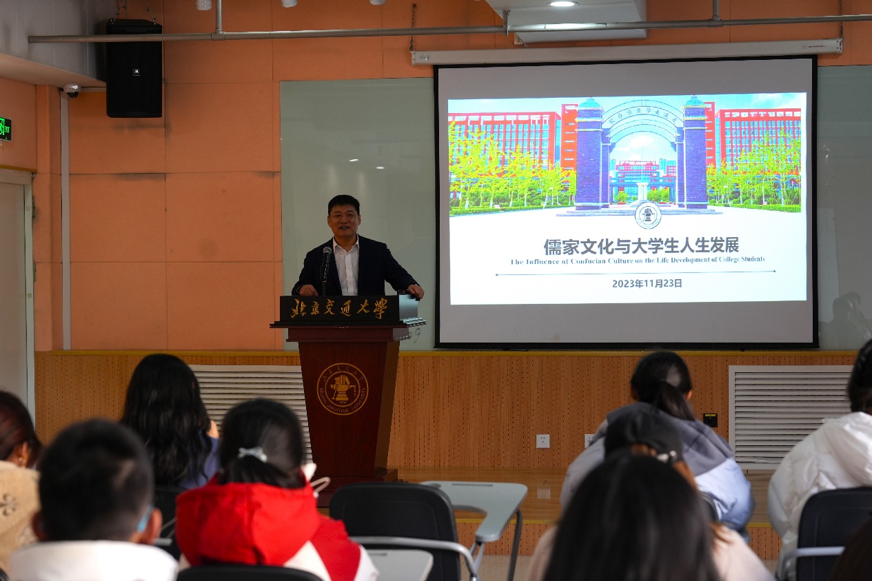 孔德立教授以思想交流的方式对儒家文化进行深刻讲解。首先,他对儒家经典著作《论语》的思想进行了详细阐述,并结合个人经历介绍儒家思想在当今社会的发展与应用。最后,他通过对社会现状的分析,表达了儒家文化对大学生人生发展的积极影响。