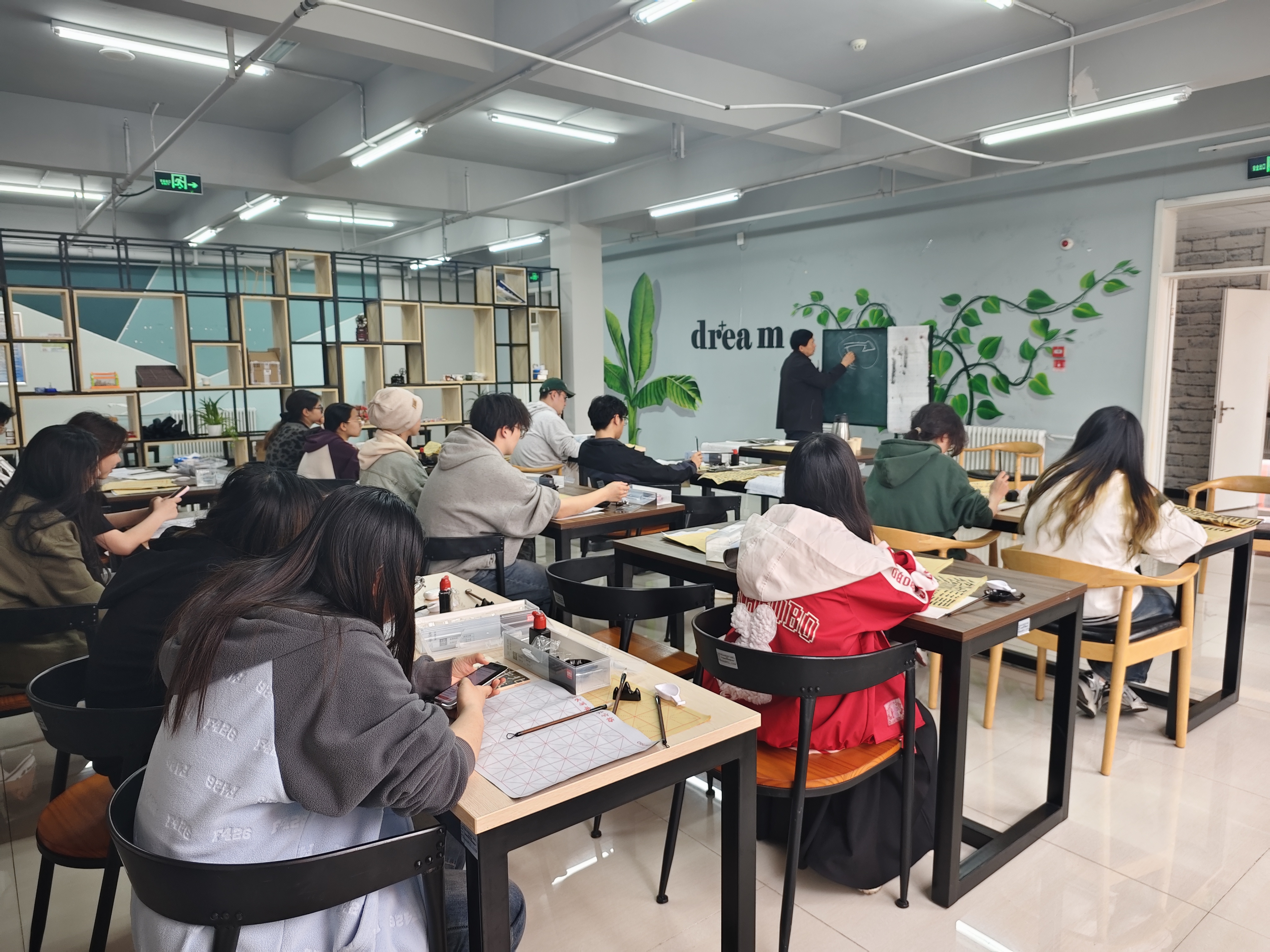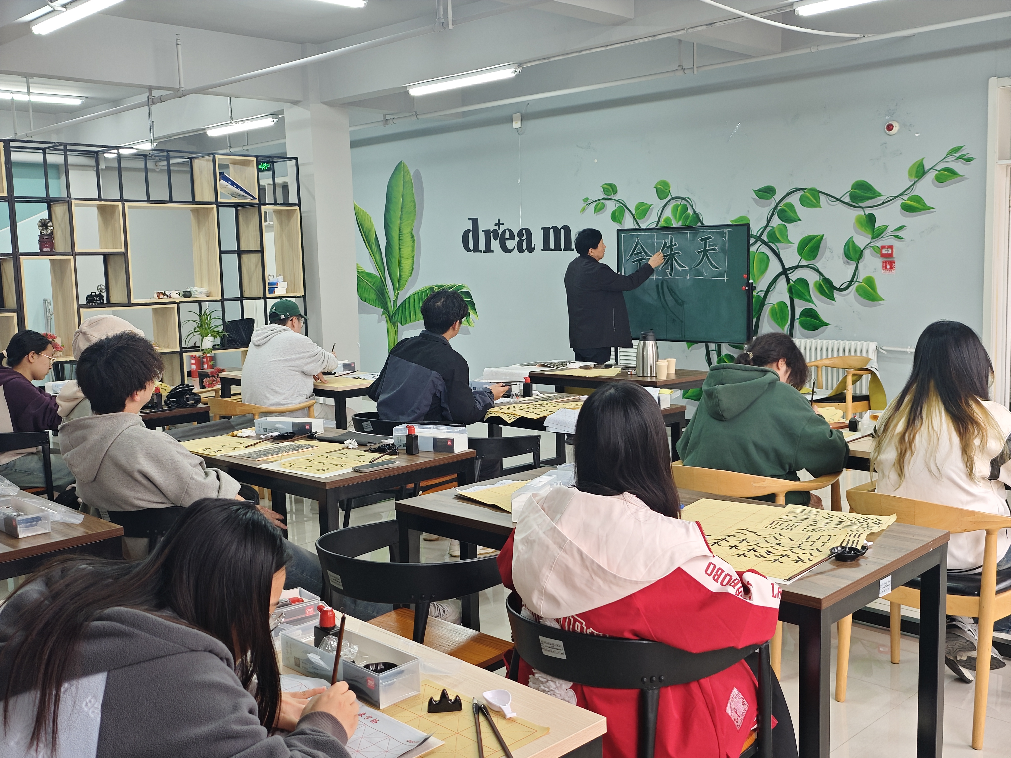活动伊始,闫老师带领同学们温习了楷书入门基础技巧,从笔画、偏旁再到组合常用字,由浅入深地讲授书写技巧,闫老师在黑板和水写纸上书写示范,讲解运笔、字形组合等书写要领。