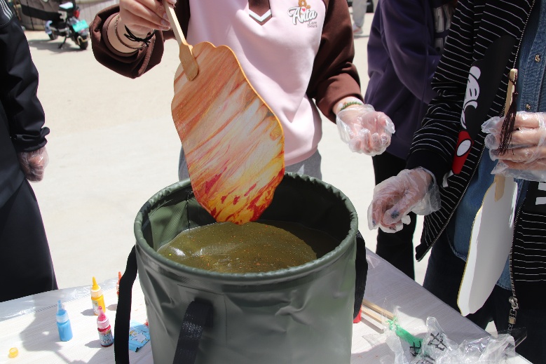 4 月 24 日,心理剧部在学生公寓中心花坛开展 “漆彩心灵,艺绘春天” 活动。现场提前备好空白漆扇、颜料、水桶等材料,师生们围坐一起亲手制作非遗漆扇,结合色彩心理学知识挑选调配颜色,在专注的创作过程中慢慢梳理内心情绪,以画笔和色彩大胆表达真实自我,收获心灵的放松与愉悦。