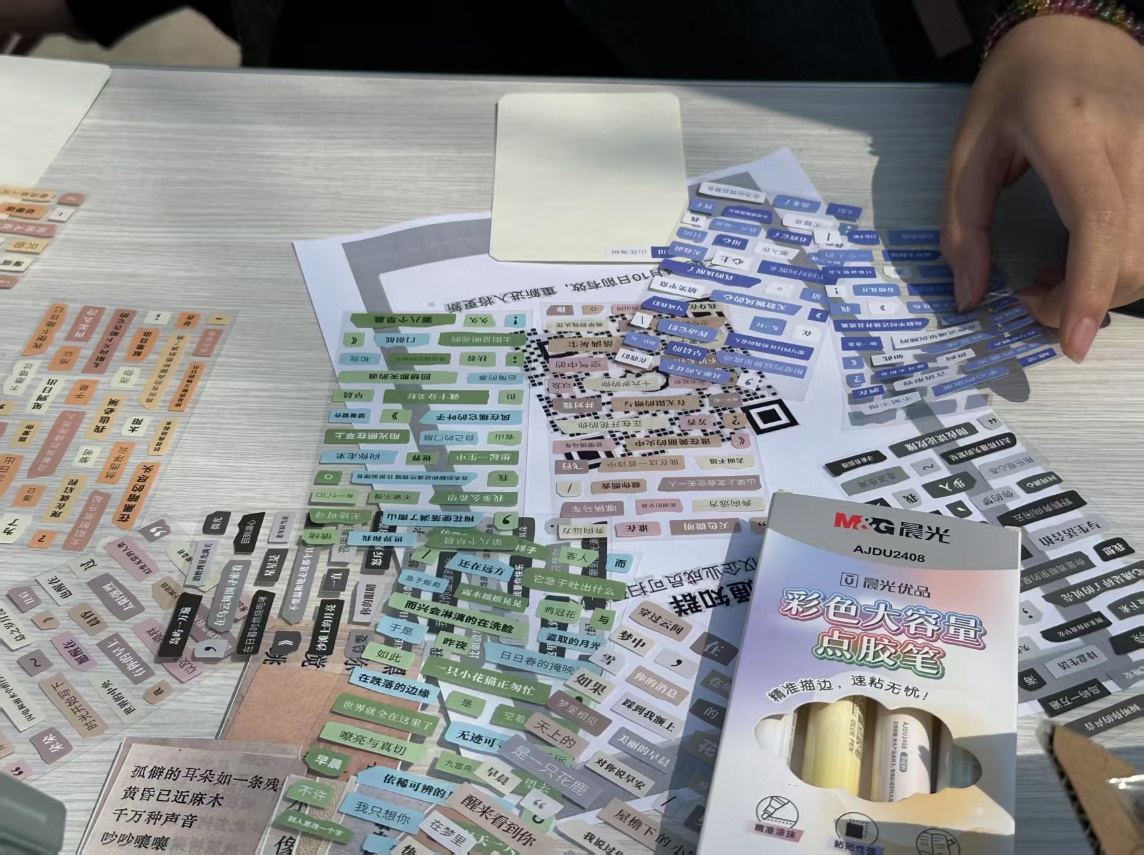 现场精心设置了四大主题互动区:“春姿未来”区设有未来信箱,参与者书写未来愿景并投入专属信箱,静候一年后与自我展开跨越时空的心灵对话;“植此青绿”区提供多肉种植体验,同学们亲手栽培多肉绿植,体悟生命培育与心灵沉淀的双重意蕴;“春漾心光”区开展艺术拼贴诗创作,通过诗歌意象的组合实现情绪纾解与自我探索;“春趣投壶”区则通过传统投壶竞技体验运动乐趣,在欢声笑语中赢取精美纪念品。