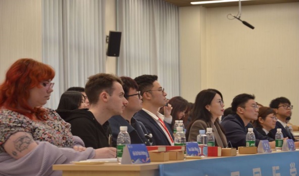 在汇报展示环节,两位同学配合默契、通力合作,充分的前期调研、严谨的数据分析、精彩的内容呈现和出色的演讲表达,赢得了现场中外评委的一致认可,展示总分在21支参会队伍中位列第三。演讲结束后,两位同学受邀参加了东道主的采访。