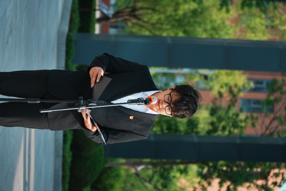 北京市优秀毕业生巩晓正深情回顾了大学四年的学习经历、志愿活动和党日活动经历,表达了对母校的感恩与眷恋。他提到,从青涩学子到时代青年的蜕变,离不开母校的培育和党组织的淬炼,并号召同学们坚定理想信念,强化使命担当,以专业之光点亮未来,将“请党放心,强国有我”的誓言化为行动。