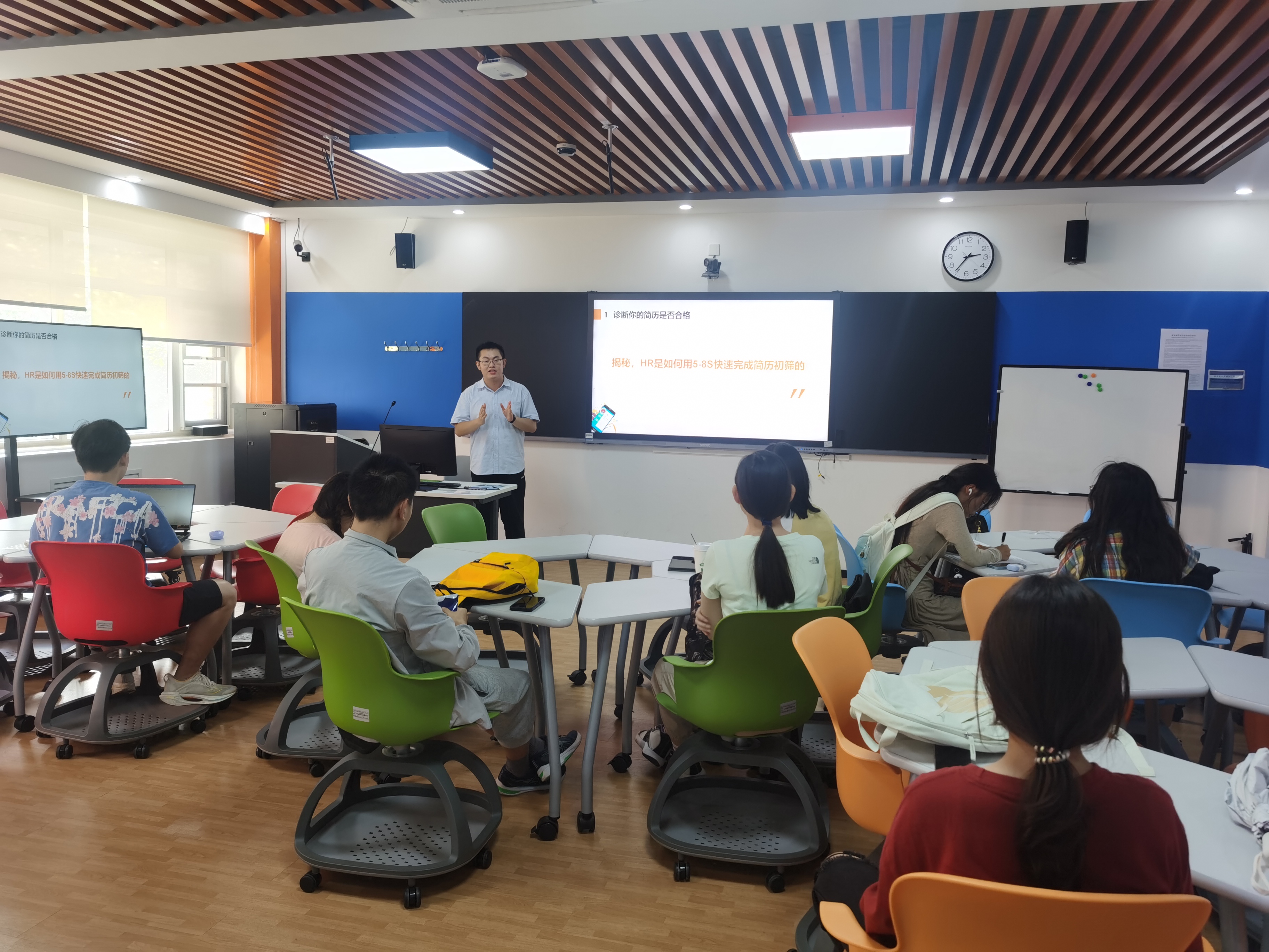 就业与创业指导中心就业指导办公室主任梁妍娇通过情景模拟,让同学们直观了解、学习到面试的表达方式,帮助同学们掌握面试技巧。曾久晟讲解了撰写简历的底层逻辑,通过具体案例分析,让同学们直观感受简历的蜕变与提升。